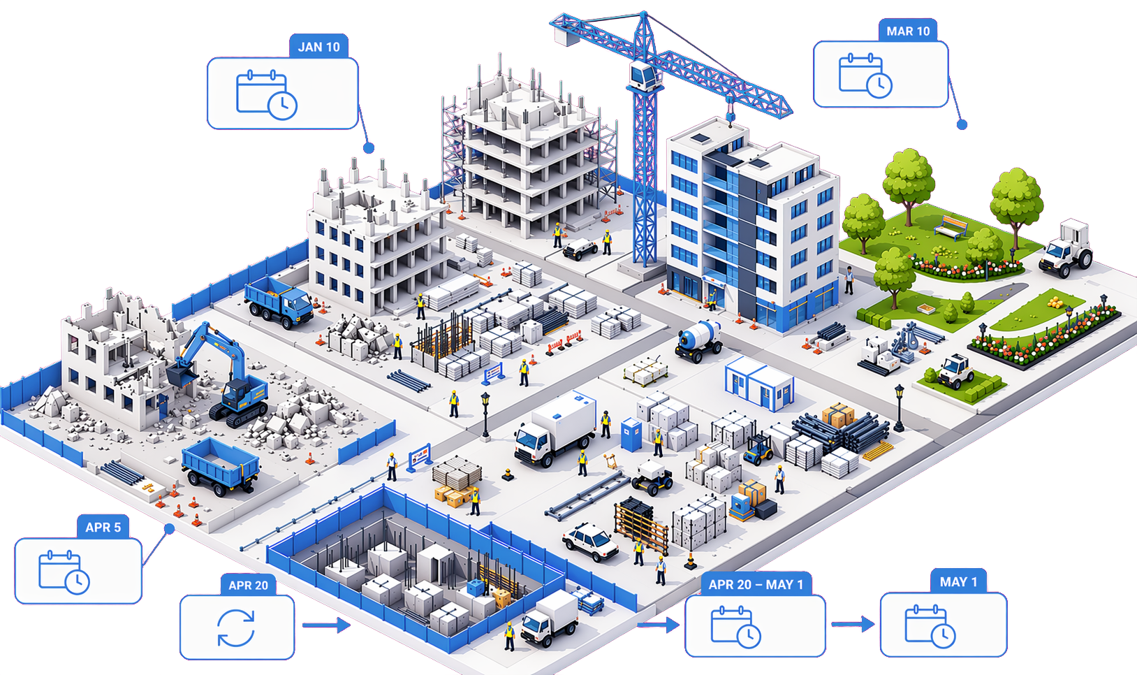 Spot clashes and constraints early before they cause delays on site. Validate programme and design together so every stakeholder has a clear visual model of delivery, from groundworks to handover.